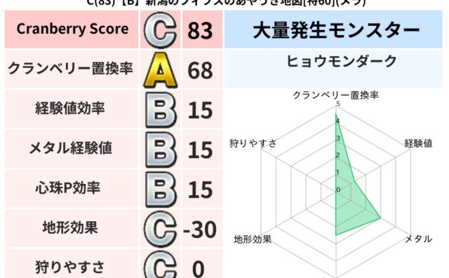 クランベリーボット判定結果の詳細クランベリースコア:104クランベリー置換率:72%大量発生モンスター:モコモコじゅうメラ超耐性(46%)系統狩り(44%)こころ道 完全一致モンスターどくろあらいゴッドハンド(守護道Lv5)ストーンマンゴッ...