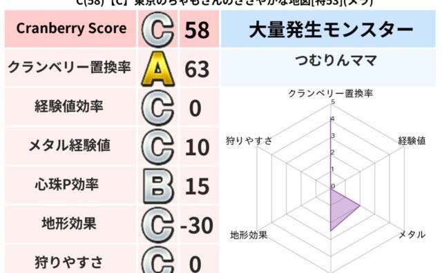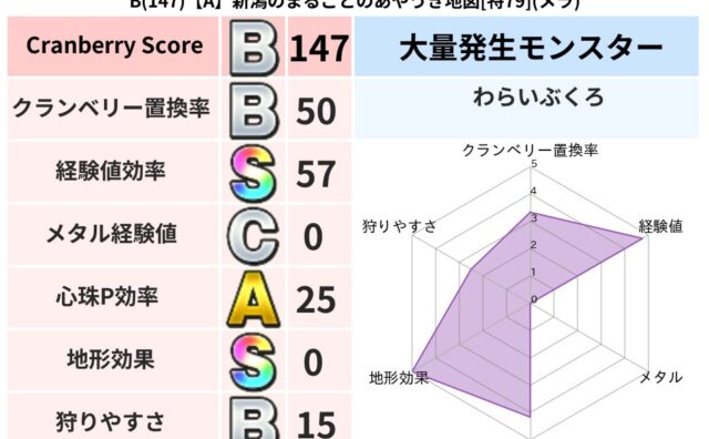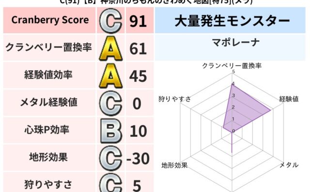 クランベリーボット判定結果の詳細クランベリースコア91クランベリー置換率61%大量発生モンスターマポレーナ超耐性メラ(52%)超耐性・弱耐性なしドルマこころ道 完全一致モンスターキャットフライニンジャ(共通Lv1)かっちゅうアリ魔人(共通L...