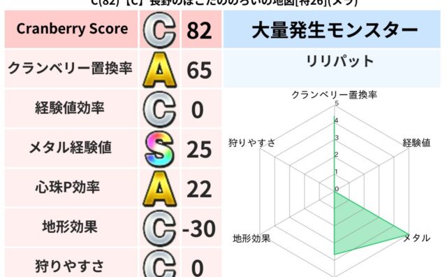 地図判定結果 C(82)【C】長野のぽこたののろいの地図[特26](メラ) クランベリーボット判定結果の詳細クランベリースコア:82クランベリー置換率:65%大量発生モンスター:リリパットメラ超耐性(82%)こころ道 完全一致モンスターシャドーニンジャ(波道Lv30)キースドラゴン大魔導士(理力道Lv5)アイアンク... 2023/12/22 11:12 地図判定結果