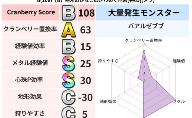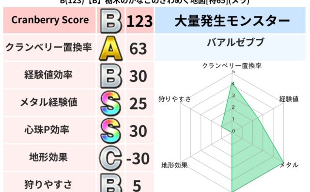 クランベリーボット判定結果の詳細クランベリースコア:103クランベリー置換率:63%大量発生モンスター:つむりんママメラ超耐性(0%)こころ道 完全一致モンスターどれいへいし: ドラゴン(人道Lv5)ナイトキャット: 守り人(まもり道Lv3...