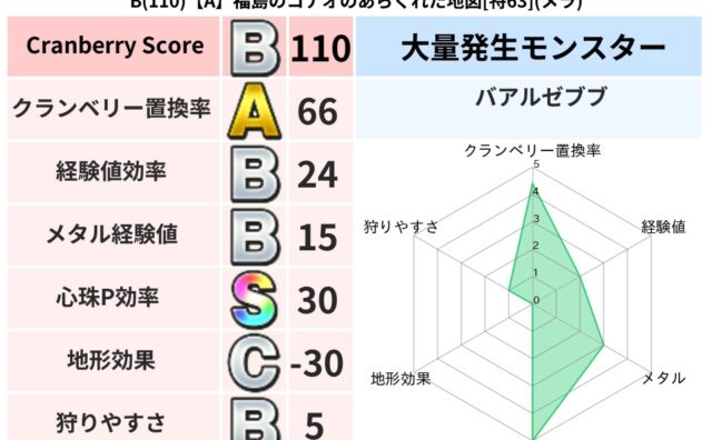 クランベリーボット判定結果の詳細クランベリースコア95クランベリー置換率66%大量発生モンスターバアルゼブブ超耐性メラ(50%)こころ道 完全一致モンスターどくイモムシニンジャ(波道Lv5)かっちゅうアリ魔人(共通Lv1)ベビーサラマンダ大...