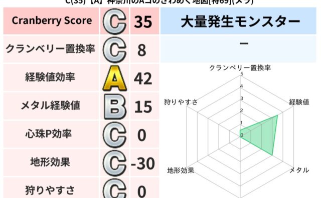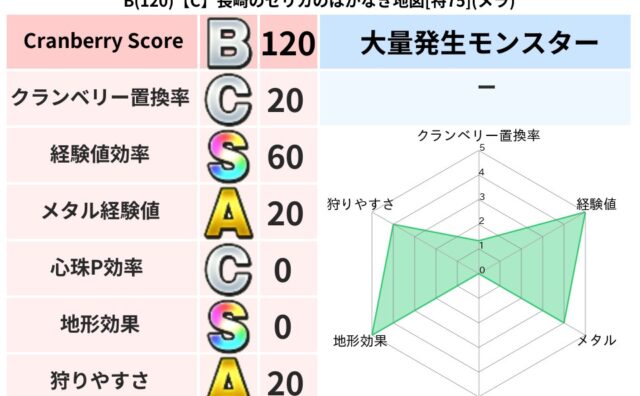 クランベリーボット判定結果の詳細クランベリースコア134クランベリー置換率48%大量発生モンスターバアルゼブブ超耐性メラ(2%)超耐性・弱耐性なしイオデインこころ道 完全一致モンスターがいこつ魔剣士(共通Lv1)ドロルメイジ大魔道士(魔力道...