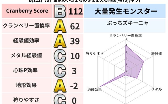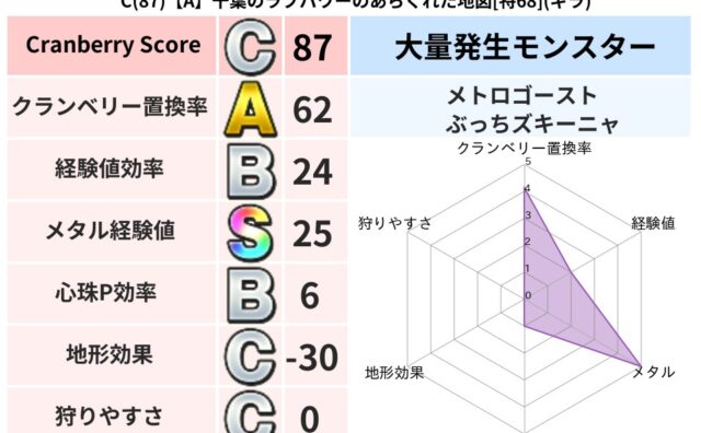 クランベリーボット判定結果の詳細クランベリースコア87クランベリー置換率62%大量発生モンスターメトロゴースト,ぶっちズキーニャ超耐性ギラ(50%)こころ道 完全一致モンスターベビーサラマンダ大神官(舞道Lv5)グリゴンダンス魔人(超魔道L...