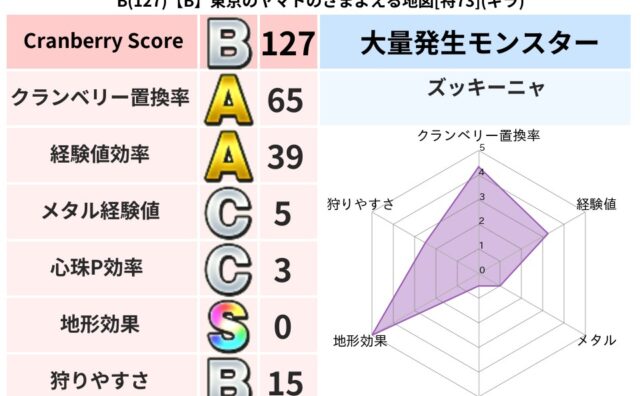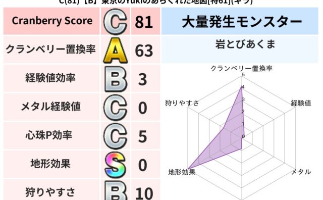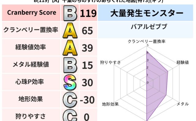 クランベリーボット判定結果の詳細クランベリースコア60クランベリー置換率65%大量発生モンスターマポレーナ超耐性ギラ(49%)こころ道 完全一致モンスターどれいへいしドラゴン(人道Lv5)さまようたましいドラゴン(人道Lv10)マポレーナゴ...