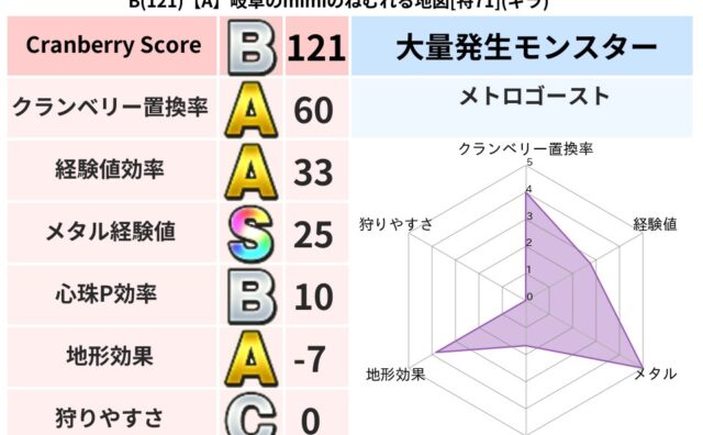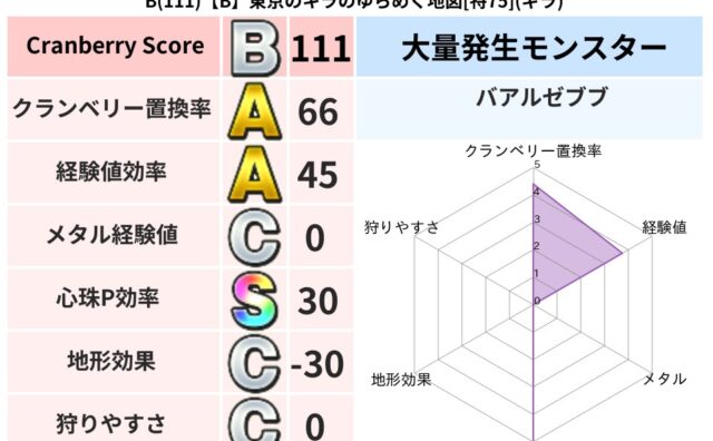 クランベリーボット判定結果の詳細クランベリースコア:91クランベリー置換率:64%大量発生モンスター:岩とびあくまギラ超耐性(87%)系統狩り(43%)こころ道 完全一致モンスターストーンマンゴッドハンド(守護道Lv5)さまようよろいゴッド...
