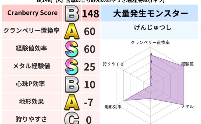 クランベリーボット判定結果の詳細クランベリースコア162クランベリー置換率57%大量発生モンスターさそりばち超耐性ギラ(0%)こころ道 完全一致モンスターしのどれいゴッドハンド(守護道Lv5)大魔道士(魔力道Lv5)くさった死体ゴッドハンド...