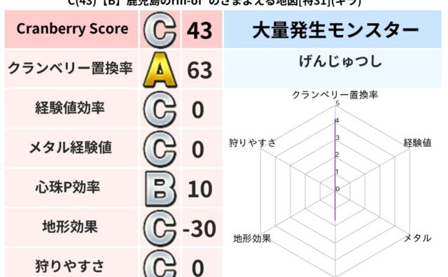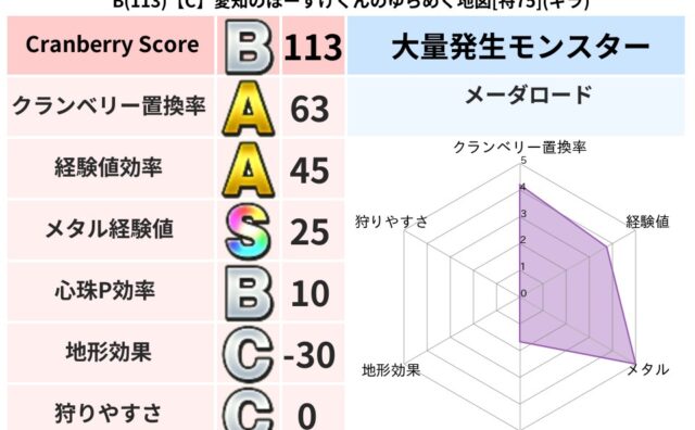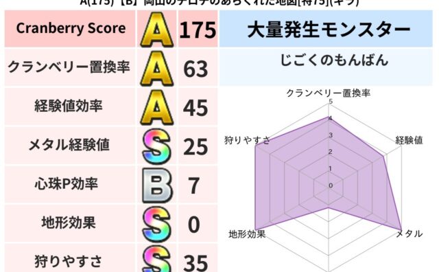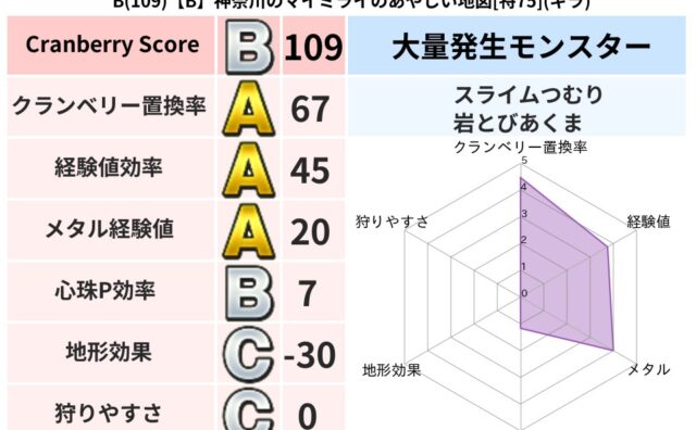 クランベリーボット判定結果の詳細クランベリースコア113クランベリー置換率63%大量発生モンスターメーダロード超耐性ギラ(77%)こころ道 完全一致モンスターパペットマン天地雷鳴士(天道Lv5)ぐんたいガニ守り人(ささえ道Lv10)たてまじ...