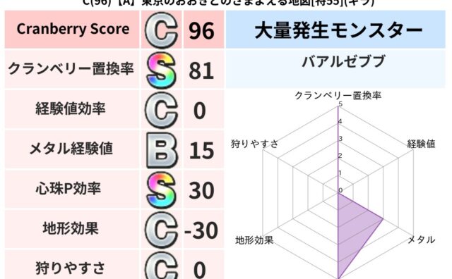 クランベリーボット判定結果の詳細クランベリースコア:126クランベリー置換率:41%大量発生モンスター:モコモコじゅう,タップペンギーギラ超耐性(12%)超耐性・弱耐性なし:デイン,ジバリアこころ道 完全一致モンスターギズモ: 天地雷鳴士(...