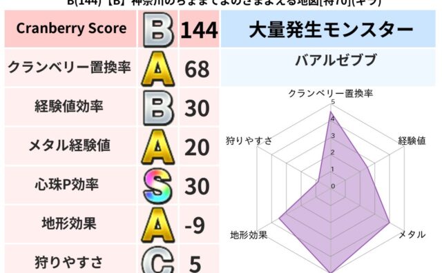 クランベリーボット判定結果の詳細クランベリースコア111クランベリー置換率74%大量発生モンスターりゅうせんし超耐性ギラ(14%)系統狩り虫系44%こころ道 完全一致モンスターがいこつ魔剣士(共通Lv1)かっちゅうアリ魔人(共通Lv1)てつ...