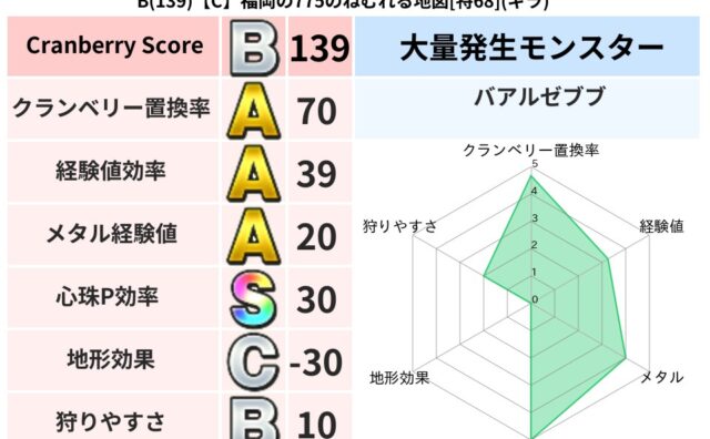 クランベリーボット判定結果の詳細クランベリースコア67クランベリー置換率63%大量発生モンスターマリンスライム超耐性ギラ(77%)系統狩り水系41%こころ道 完全一致モンスターくさった死体ゴッドハンド(守護道Lv5)大魔道士(魔力道Lv5)...