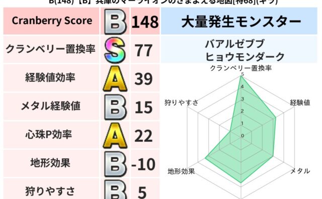 クランベリーボット判定結果の詳細クランベリースコア114クランベリー置換率70%大量発生モンスターバアルゼブブ超耐性ギラ(69%)系統狩り悪魔系41%こころ道 完全一致モンスターみならいあくまニンジャ(風道Lv5)フレイム守り人(ささえ道L...