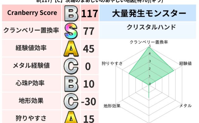 クランベリーボット判定結果の詳細クランベリースコア:137クランベリー置換率:64%大量発生モンスター:メーダロードギラ超耐性(10%)超耐性・弱耐性なし:バギこころ道 完全一致モンスタージェリーマン: 魔剣士(魔道Lv5)グリゴンダンス:...