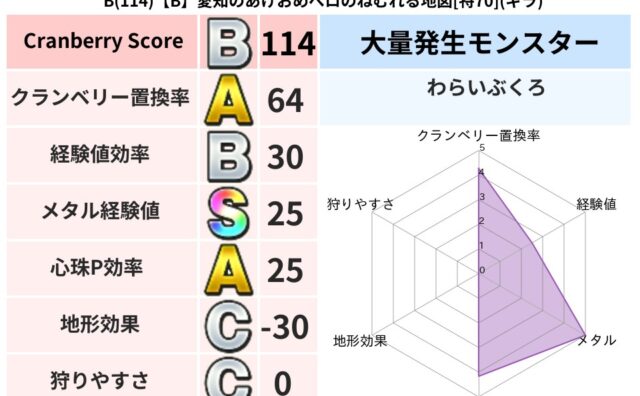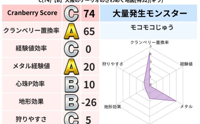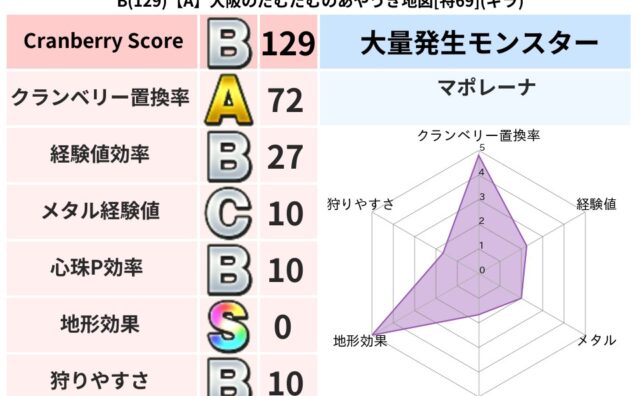 クランベリーボット判定結果の詳細クランベリースコア:159クランベリー置換率:72%大量発生モンスター:マポレーナギラ超耐性(0%)こころ道 完全一致モンスターデビルアーマー: 大神官(舞道Lv5)おおさそり: ゴッドハンド(武道Lv5),...