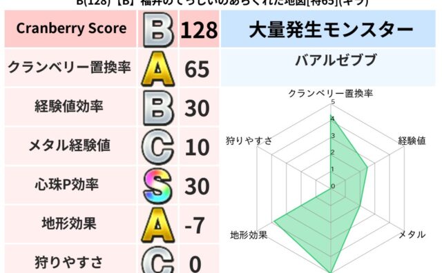 クランベリーボット判定結果の詳細クランベリースコア:143クランベリー置換率:65%大量発生モンスター:バアルゼブブギラ超耐性(6%)こころ道 完全一致モンスターベロニャーゴ: 大魔導士(理力道Lv5)びっくりサタン: 大神官(共通Lv1)...