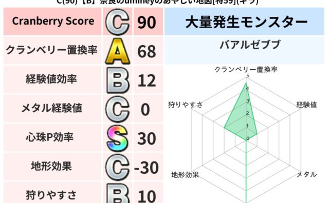 クランベリーボット判定結果の詳細クランベリースコア97クランベリー置換率63%大量発生モンスターマポレーナ超耐性ギラ(14%)こころ道 完全一致モンスターがいこつ魔剣士(共通Lv1)かっちゅうアリ魔人(共通Lv1)ドロル大神官(祈道Lv5)...