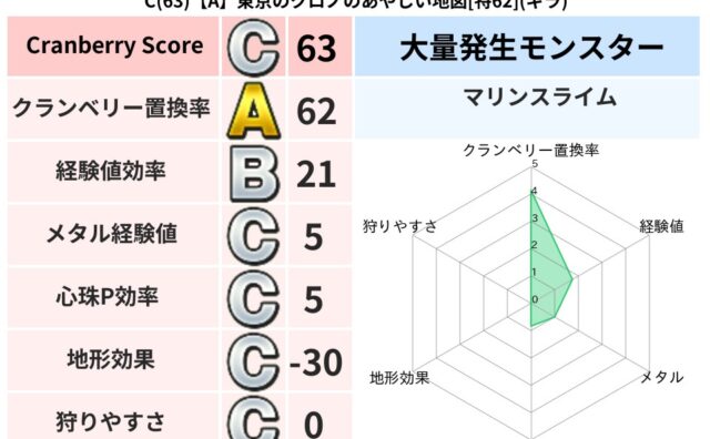 クランベリーボット判定結果の詳細クランベリースコア90クランベリー置換率81%大量発生モンスターだいおうキッズ超耐性ギラ(41%)こころ道 完全一致モンスターストーンマンゴッドハンド(守護道Lv5)まどうしゴッドハンド(守護道Lv40)ダー...