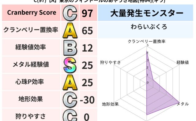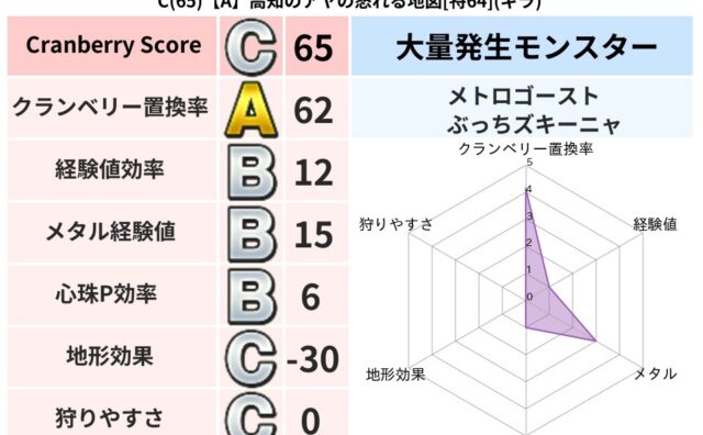クランベリーボット判定結果の詳細クランベリースコア75クランベリー置換率61%大量発生モンスタータップペンギー超耐性ギラ(46%)系統狩り水系43%こころ道 完全一致モンスタードロヌーバニンジャ(波道Lv5)ぐんたいガニ守り人(ささえ道Lv...