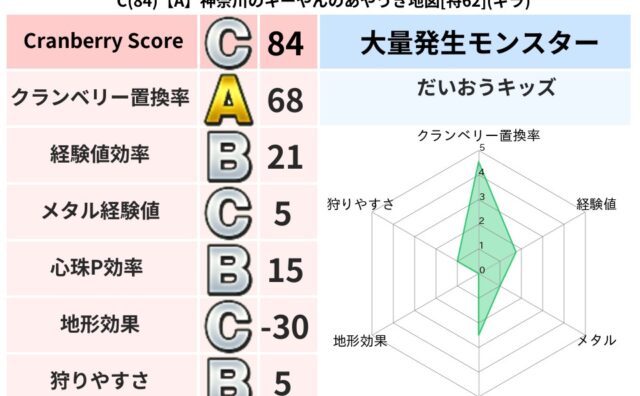 クランベリーボット判定結果の詳細クランベリースコア:99クランベリー置換率:68%大量発生モンスター:だいおうキッズギラ超耐性(0%)こころ道 完全一致モンスターベロニャーゴ: 大魔導士(理力道Lv5)おおさそり: ゴッドハンド(武道Lv5...