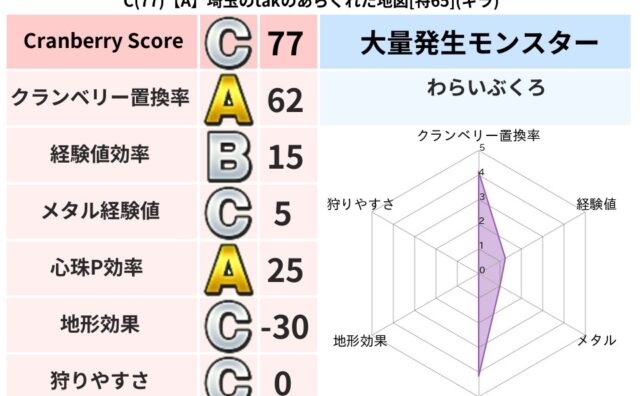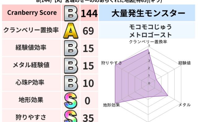 クランベリーボット判定結果の詳細クランベリースコア:149クランベリー置換率:69%大量発生モンスター:モコモコじゅう,メトロゴーストギラ超耐性(0%)こころ道 完全一致モンスターどくどくゾンビ魔剣士(共通Lv1)かっちゅうアリ魔人(共通L...