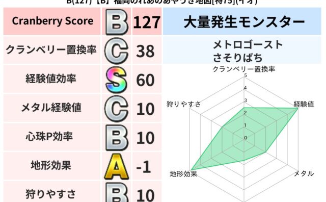地図判定結果 B(127)【B】福岡のれあのあやうき地図[特75](イオ) クランベリーボット判定結果の詳細クランベリースコア127クランベリー置換率38%大量発生モンスターメトロゴースト,さそりばち超耐性イオ(0%)超耐性・弱耐性なしバギデインこころ道 完全一致モンスターどくろあらいゴッドハンド(守護道Lv5)ね... 2025/10/16 19:02 地図判定結果