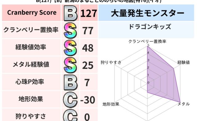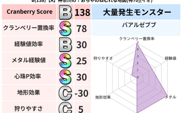 クランベリーボット判定結果の詳細クランベリースコア127クランベリー置換率77%大量発生モンスターさそりばち超耐性イオ(66%)超耐性・弱耐性なしバギデイン系統狩り虫系71%こころ道 完全一致モンスターてつのさそりゴッドハンド(守護道Lv5...