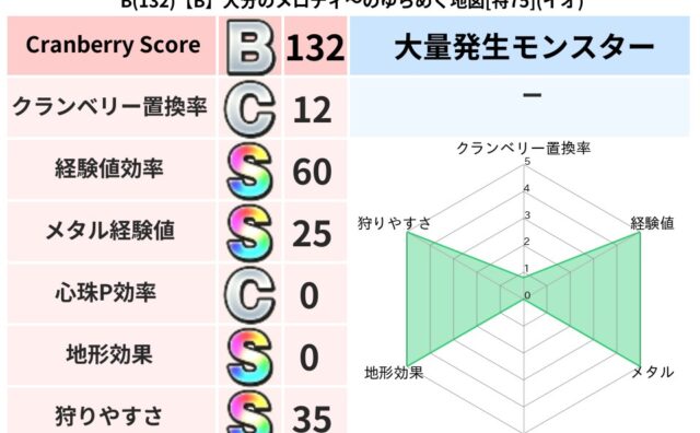 クランベリーボット判定結果の詳細クランベリースコア150クランベリー置換率78%大量発生モンスターズッキーニャ超耐性イオ(0%)超耐性・弱耐性なしドルマこころ道 完全一致モンスターパペットマン天地雷鳴士(天道Lv5)ストーンマンゴッドハンド...