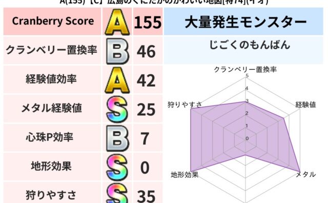 クランベリーボット判定結果の詳細クランベリースコア135クランベリー置換率64%大量発生モンスターわらいぶくろ超耐性イオ(0%)こころ道 完全一致モンスターブラウニー守り人(共通Lv1)ブラックチャックドラゴン(竜道Lv10)ポンコツ兵魔剣...