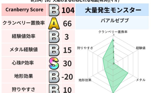 クランベリーボット判定結果の詳細クランベリースコア:104クランベリー置換率:66%大量発生モンスター:バアルゼブブイオ超耐性(17%)系統狩り(43%)こころ道 完全一致モンスターベロニャーゴ大魔導士(理力道Lv5)ストーンマンゴッドハン...