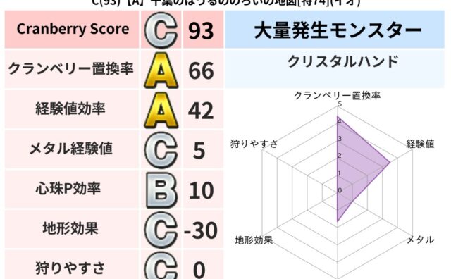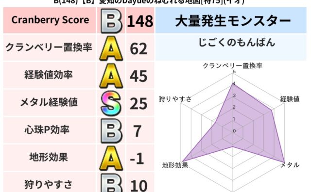 クランベリーボット判定結果の詳細クランベリースコア166クランベリー置換率48%大量発生モンスターわらいぶくろ超耐性イオ(0%)超耐性・弱耐性なしデイン系統狩り物質系53%こころ道 完全一致モンスターヘルボックル魔剣士(魔道Lv30)さまよ...