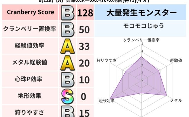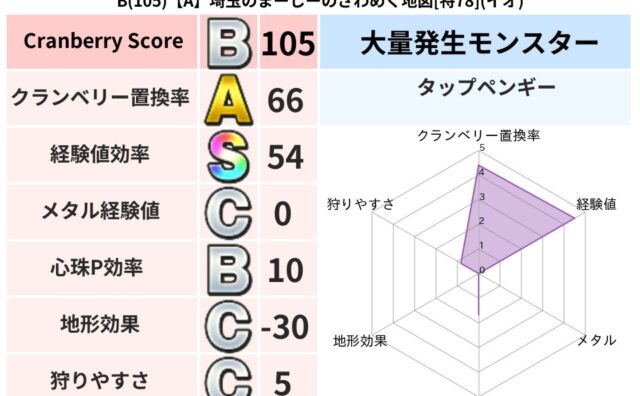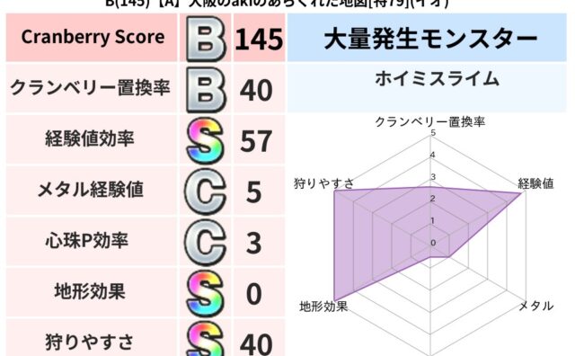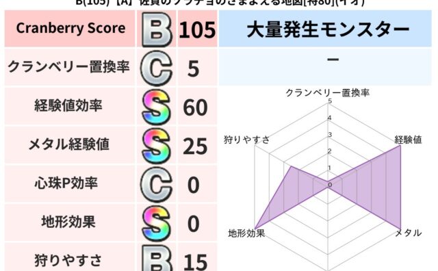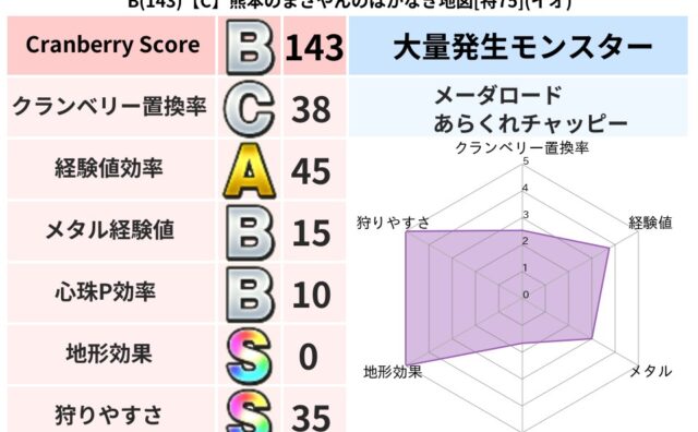 クランベリーボット判定結果の詳細クランベリースコア95クランベリー置換率65%大量発生モンスター岩とびあくま超耐性イオ(72%)系統狩り虫系48%こころ道 完全一致モンスターどくイモムシニンジャ(波道Lv5)かっちゅうアリ魔人(共通Lv1)...