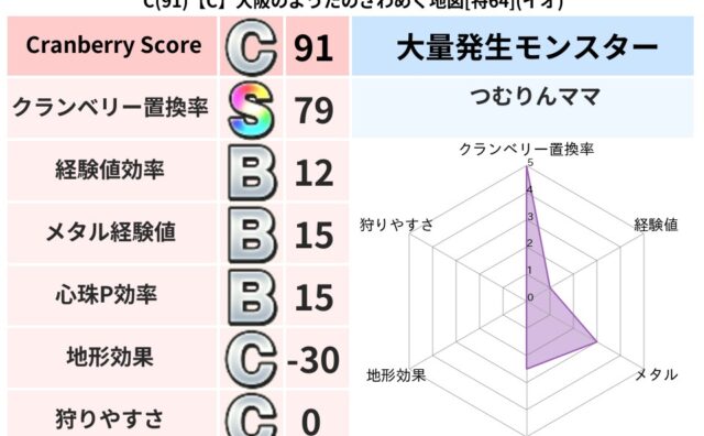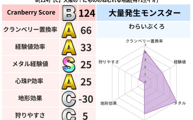 クランベリーボット判定結果の詳細クランベリースコア:123クランベリー置換率:29%大量発生モンスター:ブランマトックイオ超耐性(1%)系統狩り(60%)こころ道 完全一致モンスターしのどれい: ゴッドハンド(守護道Lv5),大魔導士(魔力...