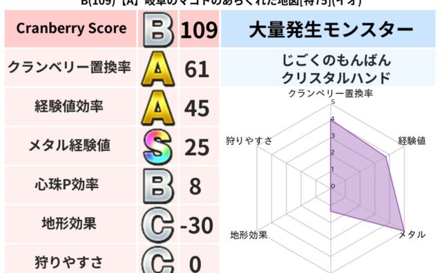クランベリーボット判定結果の詳細クランベリースコア:139クランベリー置換率:41%大量発生モンスター:ぶちスライムイオ超耐性(0%)超耐性・弱耐性なし:デイン系統狩り(41%)こころ道 完全一致モンスターぶちスライム: 大神官(祈道Lv5...