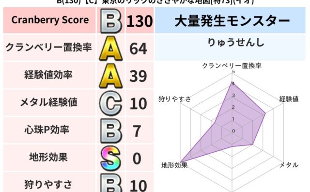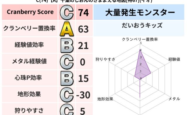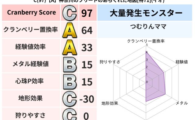 クランベリーボット判定結果の詳細クランベリースコア:62クランベリー置換率:68%大量発生モンスター:タコメットイオ超耐性(80%)こころ道 完全一致モンスタードロヌーバニンジャ(波道Lv5)シャドーニンジャ(波道Lv30)デビルアーマー大...