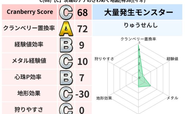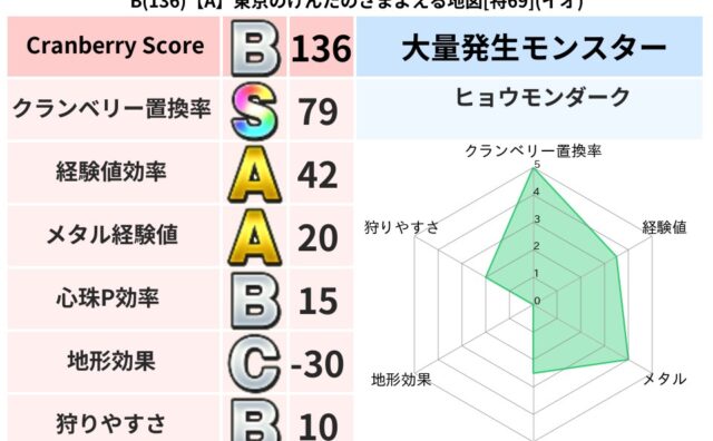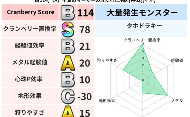 クランベリーボット判定結果の詳細クランベリースコア:99クランベリー置換率:65%大量発生モンスター:つちわらしイオ超耐性(12%)超耐性・弱耐性なし:バギこころ道 完全一致モンスタードロヌーバニンジャ(波道Lv5)ヘルボックル魔剣士(魔道...
