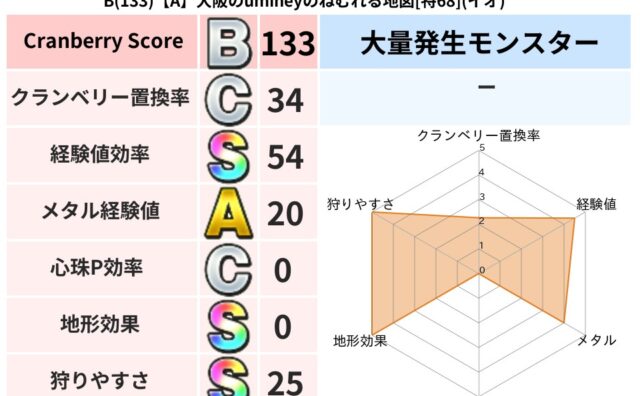 クランベリーボット判定結果の詳細クランベリースコア:129クランベリー置換率:78%大量発生モンスター:タホドラキーイオ超耐性(42%)超耐性・弱耐性なし:ドルマ系統狩り(48%)こころ道 完全一致モンスターストーンマン: ゴッドハンド(守...