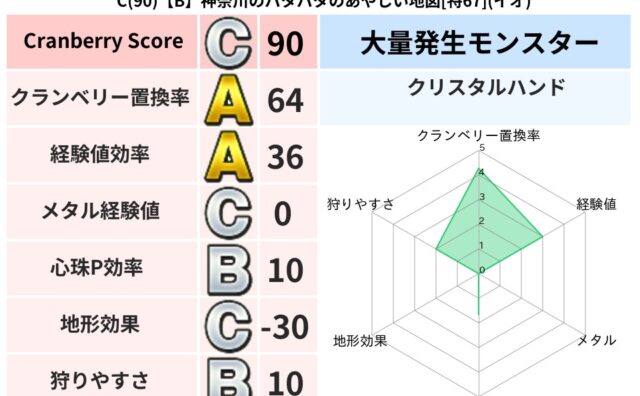 クランベリーボット判定結果の詳細クランベリースコア:90クランベリー置換率:64%大量発生モンスター:クリスタルハンドイオ超耐性(80%)系統狩り(41%)こころ道 完全一致モンスターキャットフライニンジャ(共通Lv1)どくイモムシニンジャ...