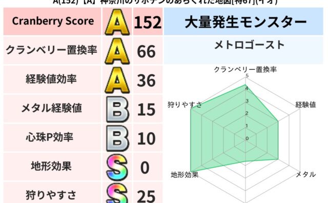 クランベリーボット判定結果の詳細クランベリースコア74クランベリー置換率60%大量発生モンスターマポレーナ超耐性イオ(9%)こころ道 完全一致モンスターみならいあくまニンジャ(風道Lv5)リカントマムルドラゴン(竜道Lv5)キースドラゴン大...