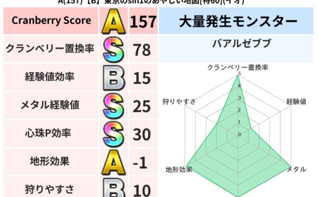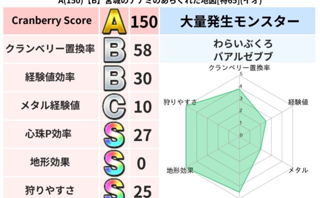 クランベリーボット判定結果の詳細クランベリースコア132クランベリー置換率78%大量発生モンスターバアルゼブブ超耐性イオ(1%)系統狩り悪魔系47%こころ道 完全一致モンスターヘルボックル魔剣士(魔道Lv30)ストーンマンゴッドハンド(守護...
