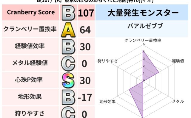 クランベリーボット判定結果の詳細クランベリースコア115クランベリー置換率63%大量発生モンスターメーダロード,りゅうせんし超耐性イオ(5%)こころ道 完全一致モンスターストーンマンゴッドハンド(守護道Lv5)メーダロードゴッドハンド(武道...