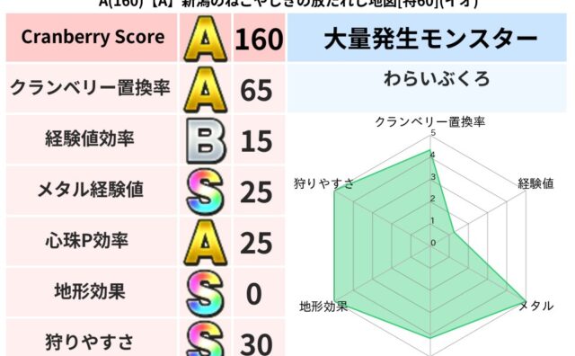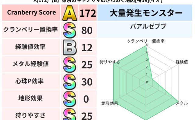 クランベリーボット判定結果の詳細クランベリースコア113クランベリー置換率67%大量発生モンスタースライムつむり超耐性イオ(5%)超耐性・弱耐性なしバギこころ道 完全一致モンスターしりょうのきし大神官(舞道Lv5)イエティ魔剣士(刃道Lv1...