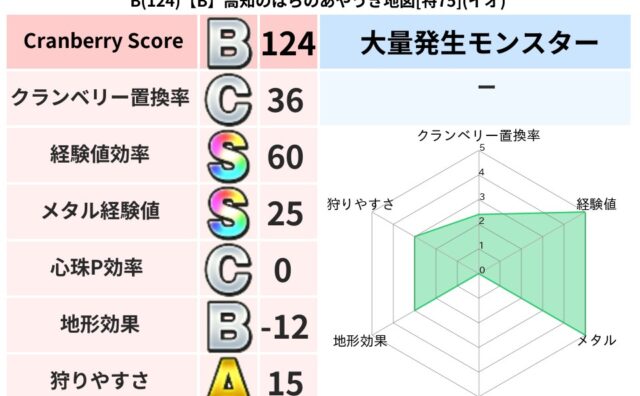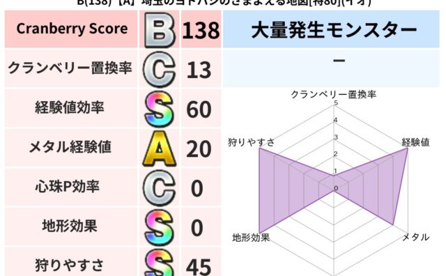 クランベリーボット判定結果の詳細クランベリースコア82クランベリー置換率60%大量発生モンスターりゅうせんし超耐性イオ(0%)こころ道 完全一致モンスターキメラ大魔道士(共通Lv1)ベビーサラマンダ大神官(舞道Lv5)イエティ魔剣士(刃道L...