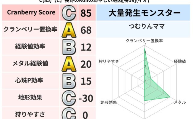 地図判定結果 C(85)【C】長野のKohのあやしい地図[特59](イオ) クランベリーボット判定結果の詳細クランベリースコア:85クランベリー置換率:68%大量発生モンスター:つむりんママイオ超耐性(57%)こころ道 完全一致モンスターキースドラゴン大魔導士(理力道Lv5)つかいま大魔導士(理力道Lv5)どくイモ... 2024/01/25 07:30 地図判定結果