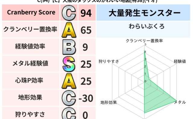 地図判定結果 C(94)【C】大阪のダックスのかわいい地図[特58](イオ) クランベリーボット判定結果の詳細クランベリースコア:94クランベリー置換率:65%大量発生モンスター:わらいぶくろイオ超耐性(50%)こころ道 完全一致モンスターくさった死体ゴッドハンド(守護道Lv5),大魔導士(魔力道Lv5)シャドーニン... 2024/01/30 13:52 地図判定結果