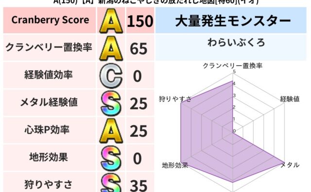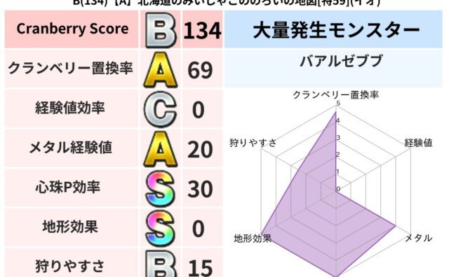 クランベリーボット判定結果の詳細クランベリースコア170クランベリー置換率80%大量発生モンスターバアルゼブブ超耐性イオ(0%)超耐性・弱耐性なしバギこころ道 完全一致モンスターフレイム守り人(ささえ道Lv5)ストーンマンゴッドハンド(守護...