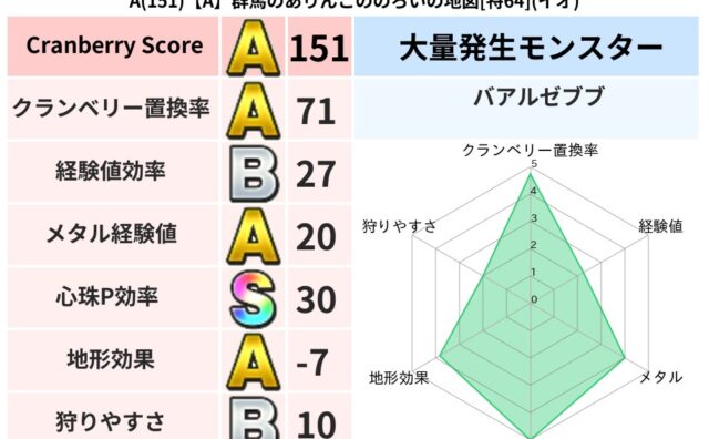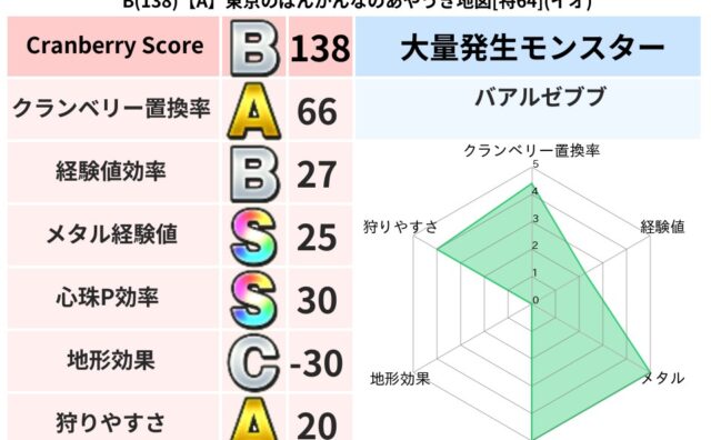 クランベリーボット判定結果の詳細クランベリースコア77クランベリー置換率67%大量発生モンスターモコモコじゅう超耐性イオ(73%)系統狩りけもの系44%こころ道 完全一致モンスターキャットフライニンジャ(共通Lv1)ギズモ天地雷鳴士(共通L...