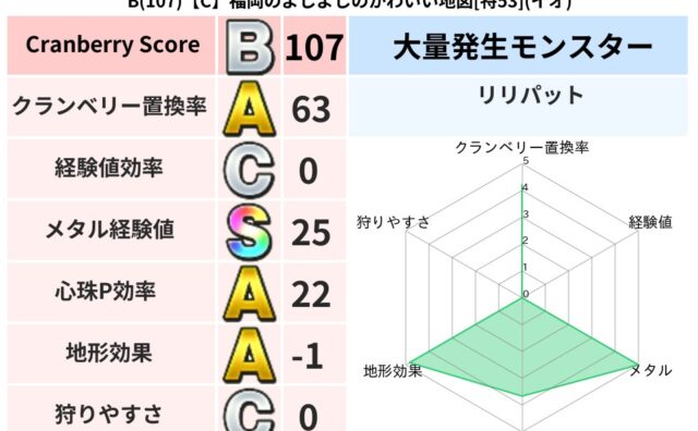 地図判定結果 B(107)【C】福岡のよしよしのかわいい地図[特53](イオ) クランベリーボット判定結果の詳細クランベリースコア:107クランベリー置換率:63%大量発生モンスター:リリパットイオ超耐性(2%)こころ道 完全一致モンスターつかいま大魔導士(理力道Lv5)キラーパンサー大神官(祈道Lv10)メイジキメラ... 2024/01/08 06:16 地図判定結果