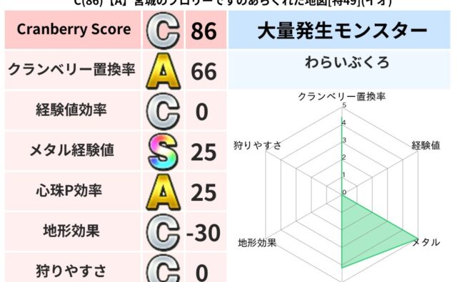 地図判定結果 C(86)【A】宮城のプロリーですのあらくれた地図[特49](イオ) クランベリーボット判定結果の詳細クランベリースコア:86クランベリー置換率:66%大量発生モンスター:わらいぶくろイオ超耐性(52%)こころ道 完全一致モンスターどれいへいしドラゴン(人道Lv5)シャドーニンジャ(波道Lv30)ストーンマン... 2024/01/07 10:55 地図判定結果