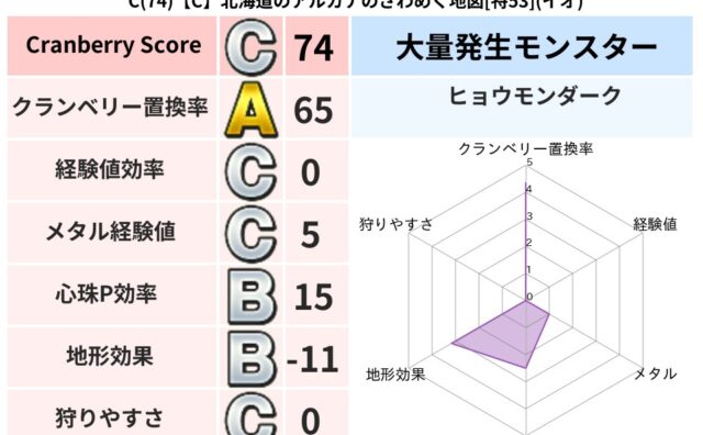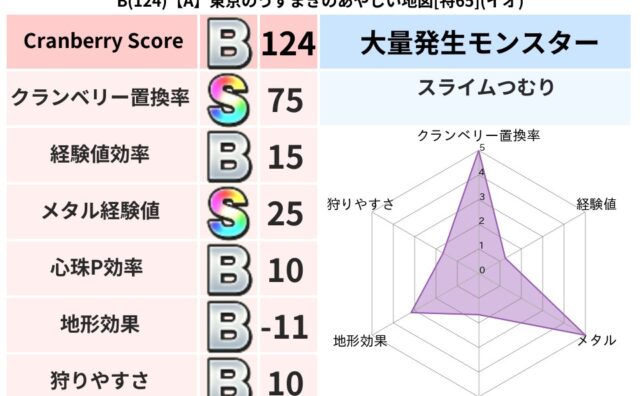 クランベリーボット判定結果の詳細クランベリースコア:83クランベリー置換率:65%大量発生モンスター:ヒョウモンダークイオ超耐性(0%)こころ道 完全一致モンスターベビーサラマンダ: 大神官(舞道Lv5)スマイルロック: 守り人(ささえ道L...