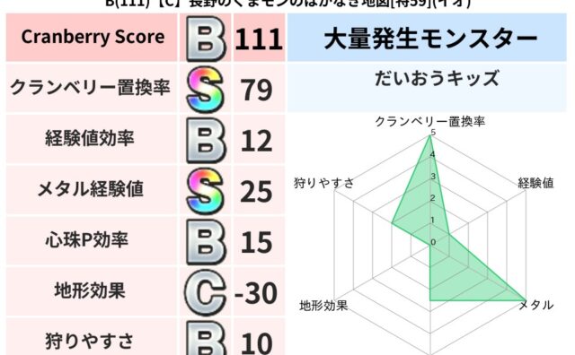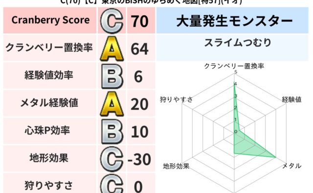 地図判定結果 C(45)【C】新潟のスハのかわいい地図[基32](イオ) クランベリーボット判定結果の詳細クランベリースコア:45クランベリー置換率:60%大量発生モンスター:マリンスライムイオ超耐性(51%)こころ道 完全一致モンスターしのどれいゴッドハンド(守護道Lv5),大魔導士(魔力道Lv5)どくイモムシ... 2023/12/01 13:42 地図判定結果