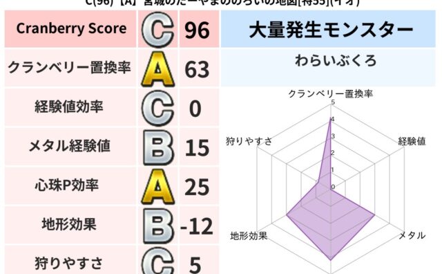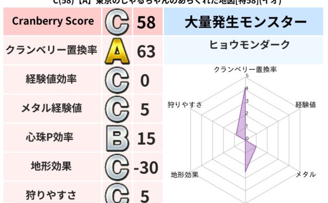 クランベリーボット判定結果の詳細クランベリースコア60クランベリー置換率67%大量発生モンスターじごくのもんばん,タップペンギー超耐性イオ(63%)こころ道 完全一致モンスターヘルボックル魔剣士(魔道Lv30)キャタピラーニンジャ(風道Lv...